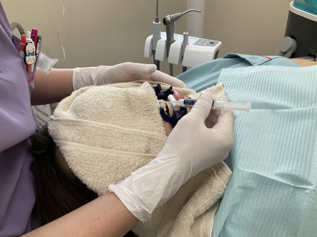 歯肉を保護し、ホワイトニングジェルを歯面に塗布します。