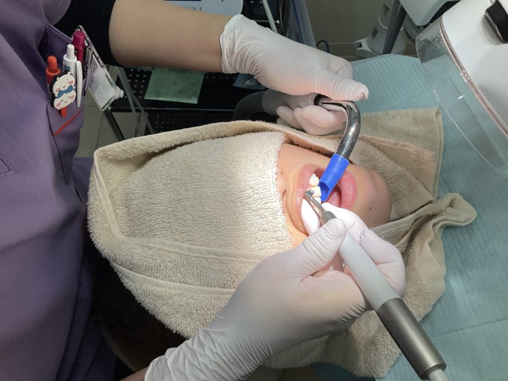 まず歯の表面の汚れを、エアフローを用いて徹底的に落とします。